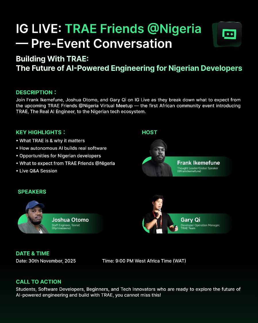 This Instagram Live session brings together the TRAE team and the Nigerian developer community for a pre-event conversation ahead of TRAE Friends @Nigeria.